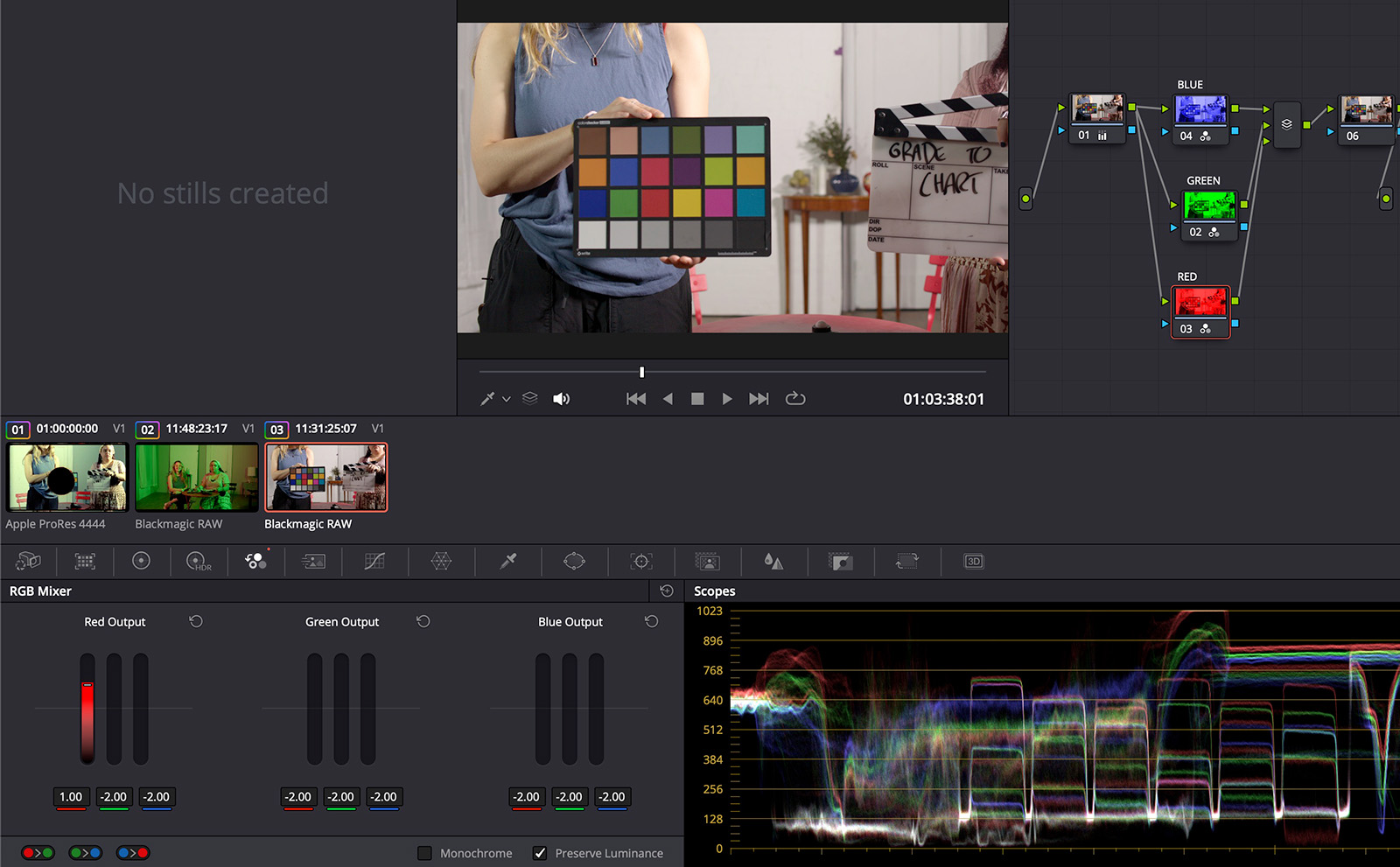 正确做法的关键是要用一个并行节点将图像处理分成三个独立的色彩通道。在创建了包含作用于图像的三个独立节点的一个并行节点树后,将它们标记为红色、绿色和蓝色(我通常会将蓝色放在最上面,红色放最下面,模拟胶片的感光层)。要这么做就得要进入色彩混合器,设置成一个仅绿色节点、一个仅蓝色节点以及一个仅红色节点,并且确保将所有其他设置降到-2。现在,你就有了独立的红色、绿色及蓝色的色彩控制。