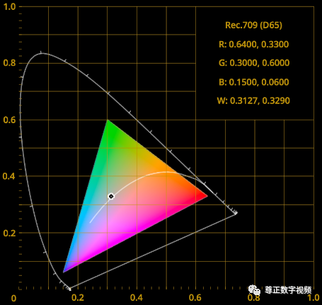 Rec.709规定的纯色红(R)、纯色绿(G)、纯色蓝(B)以及白点(W)的色度值如下: