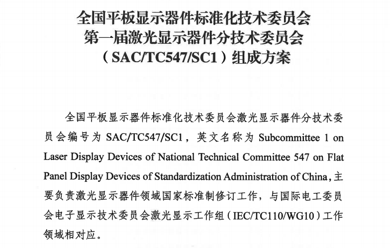 5月26日,中国国家标准化管理委员会发布公告,全国平板显示器件标准化技术委员会激光显示器件分技术委员会正式成立。