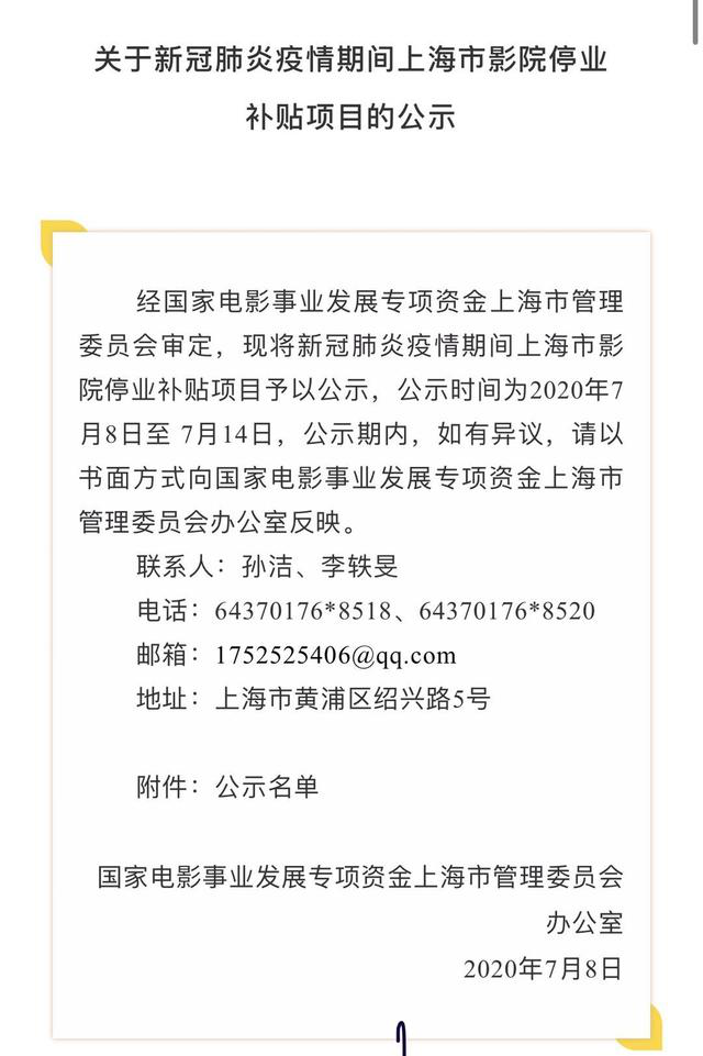 7月8日,国家电影事业发展专项资金上海市管理委员会发布了《关于新冠肺炎疫情期间上海市影院停业补贴项目的公示》。