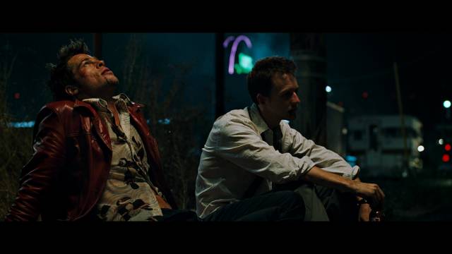 你可以很明显地感觉到在《搏击俱乐部》的这个镜头里面,光源刻意布局得就像是街灯的光线一样。没有补光,也没有环境光源,对比看起来很鲜明。同时,为了让角色的脸呈现,布拉德·皮特把脸抬了起来。由此可见,演员的动作也会影响灯光聚焦的位置。