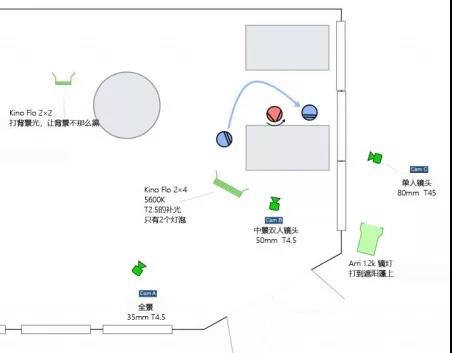 以这个作为基础光是可以了,但在拍单人镜头时,需要主光在演员脸部能有所延伸,因为两个人物在扭头聊天时,眼睛会有点暗。为了解决这个问题,我们在摄像机的左侧架了一盏2×4的Kino,这样补光一侧就与主光协调了。
