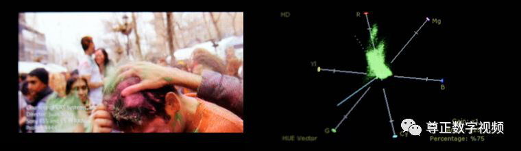 HUE矢量示波器是由《调色师手册》的作者著名调色师Alexis设计的,大幅简化了NTSC的矢量示波器,有明确的标记线指向三原色和三个中间色,并提供了75%和100%的刻度标记定义色彩的饱和度,设定了同相定位参考线和用户自定义参考线。