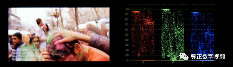 RGB分量波形分别显示红、绿、蓝三个分离的波形,观察RGB分量显示可以了解画面红绿蓝每一个颜色通道的强度,可以独立观察每个通道的波形,方便的判断色偏。每一个分量波形从左至右代表了场景中不同位置的色彩通道的强度。