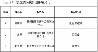 为引导和鼓励优秀网络视听节目制作播出,提升网络视听节目内容品质,国家广播电视总局今年继续开展网络视听节目内容建设专项资金扶持项目评审工作。日前,经省级广电行政部门和中央直属单位等推荐,专家评审委员会审议,最终确定2018年度网络视听节目内容建设扶持项目之一——2018年度优秀网络视听作品推选活动扶持项目名单。其中年度优秀网络电影长、短片名单如下: