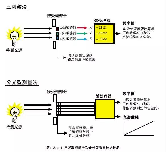 光学测量仪器根据工作原理一般可以分为分光型的光谱仪和分色型的色度计: