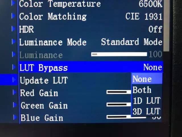 如果目标监视器可以关闭校正,需要还原校正前原始色度进行测试(尊正监视器可以如图选择both,同时关闭1DLUT和3DLUT,显示屏色度的原始效果)。