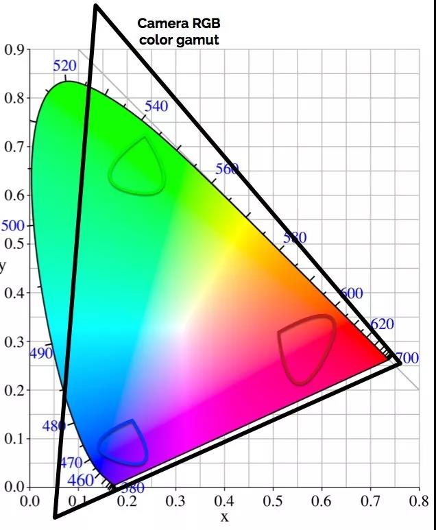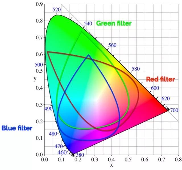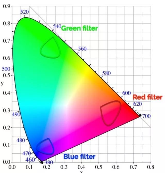 相机的红色、绿色和蓝色端点都是一片片色彩区域,而不是一个特定的色相。因为要让端点落到一个特定的色相点上,那就要求滤片极为纯正,纯正到不会和其它的滤片有任何交叠,那么相机就能看到十分纯正的红、蓝、绿了,但代价就是除此之外其它任何东西都看不到。这问题就大了,因为现实世界中根本就没有什么东西是纯红色、纯蓝色或者绿色的。