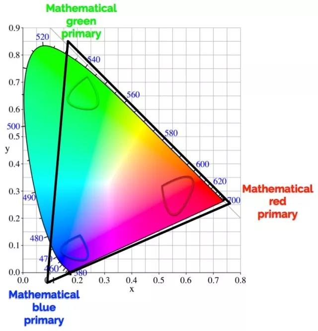 但退一步讲,定义色彩空间是一定要一个原色的。所以色彩科学专家所做的就是定义一个可以完全覆盖这些色彩区域的色彩空间,也就是给他们自己留有一些施展拳脚的空间。这样的一个色域是通过数学算法在电脑里面进行定义的。