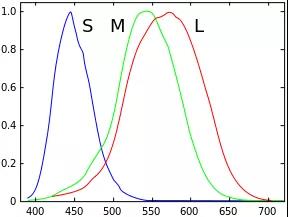 上面这张图是人眼视锥细胞的光谱响应图表,其中S锥细胞响应蓝色刺激,M响应绿色刺激,L响应红光刺激。
