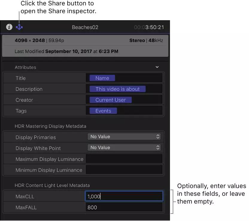 Final Cut Pro 不支持其它HDR格式的创建,如HDR10+、杜比视界、Advanced HDR,但可通过Final Cut Pro 导出Rec. 2020 PQ的HDR影片,并用其它调色软件生成这些格式所需的元数据。