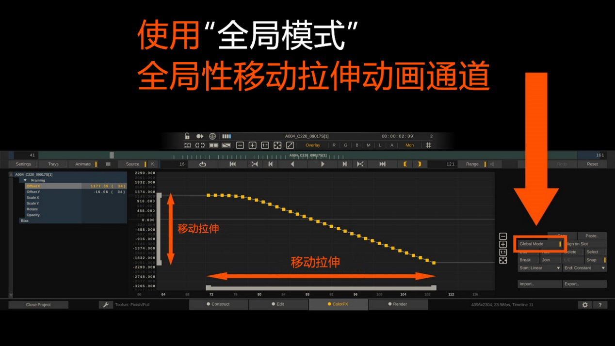 只需要启动“全局模式”,该模式能开启编辑器的X轴和Y轴两条控制条,移动其中任意一条就会改动动画效果,抓取控制条末的控制柄就能拉伸动画效果。