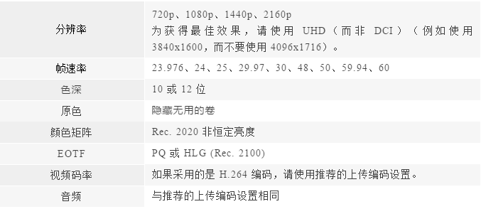 使用 PQ 信号的 HDR 视频还应说明其制作母版所用的显示设备(SMPTE ST 2086 母版元数据)以及内容的亮度(CEA 861-3 MaxFALL 和 MaxCLL)。如果缺少这些信息,我们会使用 Sony BVM-X300 母版显示设备所对应的值,这是目前制作 HDR 母版最常用的显示设备。