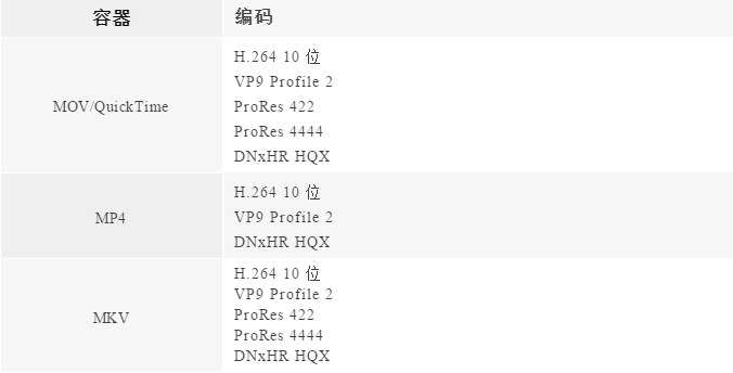 经测试,下述容器与编解码器组合可正常发挥作用。您可能还可以使用其他带有 HDR 元数据的高品质 10 位编解码器。
