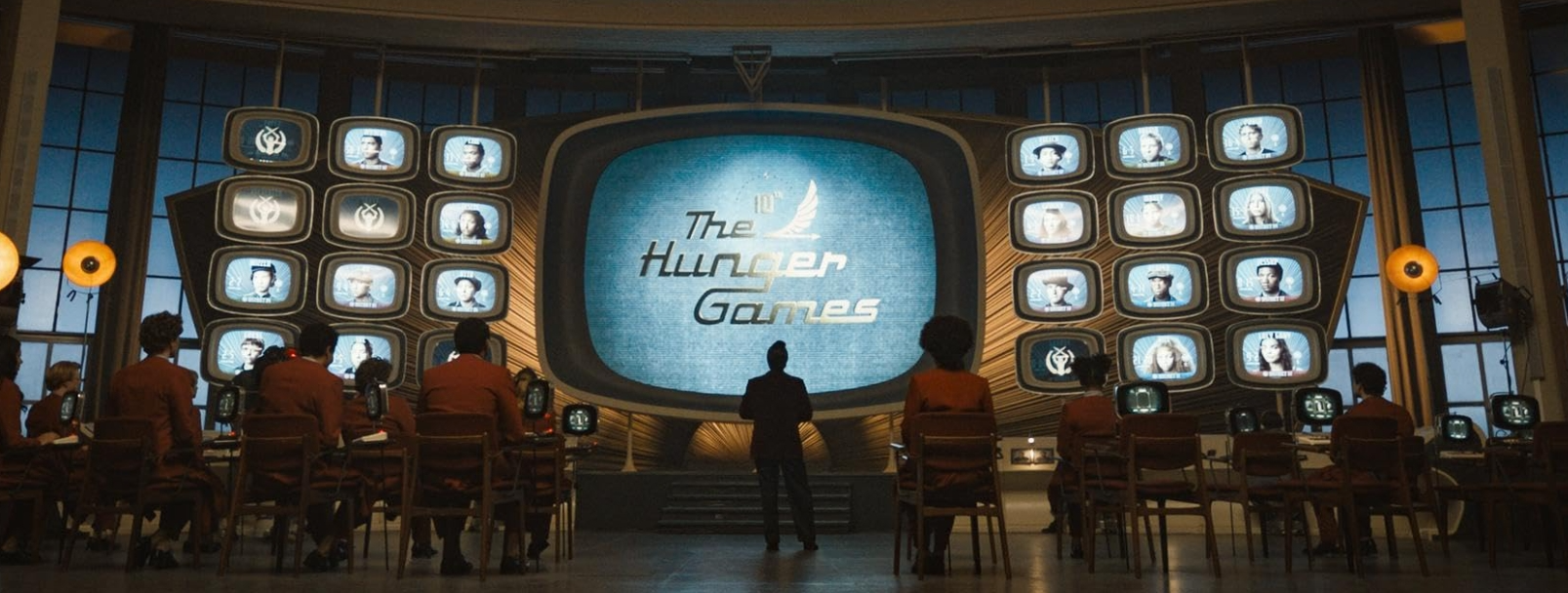 《饥饿游戏:鸣鸟与蛇之歌》幕后的尊正监视器上可见年轻的斯诺总统