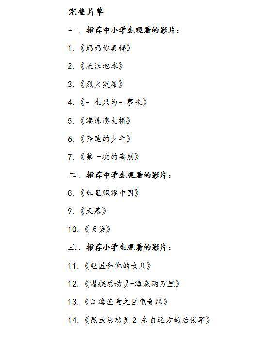 9月17日,教育部官网公布《第39批向全国中小学生推荐优秀影片片目》,其中推荐中小学生观看的影片7部,推荐中学生观看的影片3部,推荐小学生观看的影片4部。《流浪地球》《烈火英雄》《港珠澳大桥》《第一次的离别》《昆虫总动员2-来自远方的后援军》等影片入选。