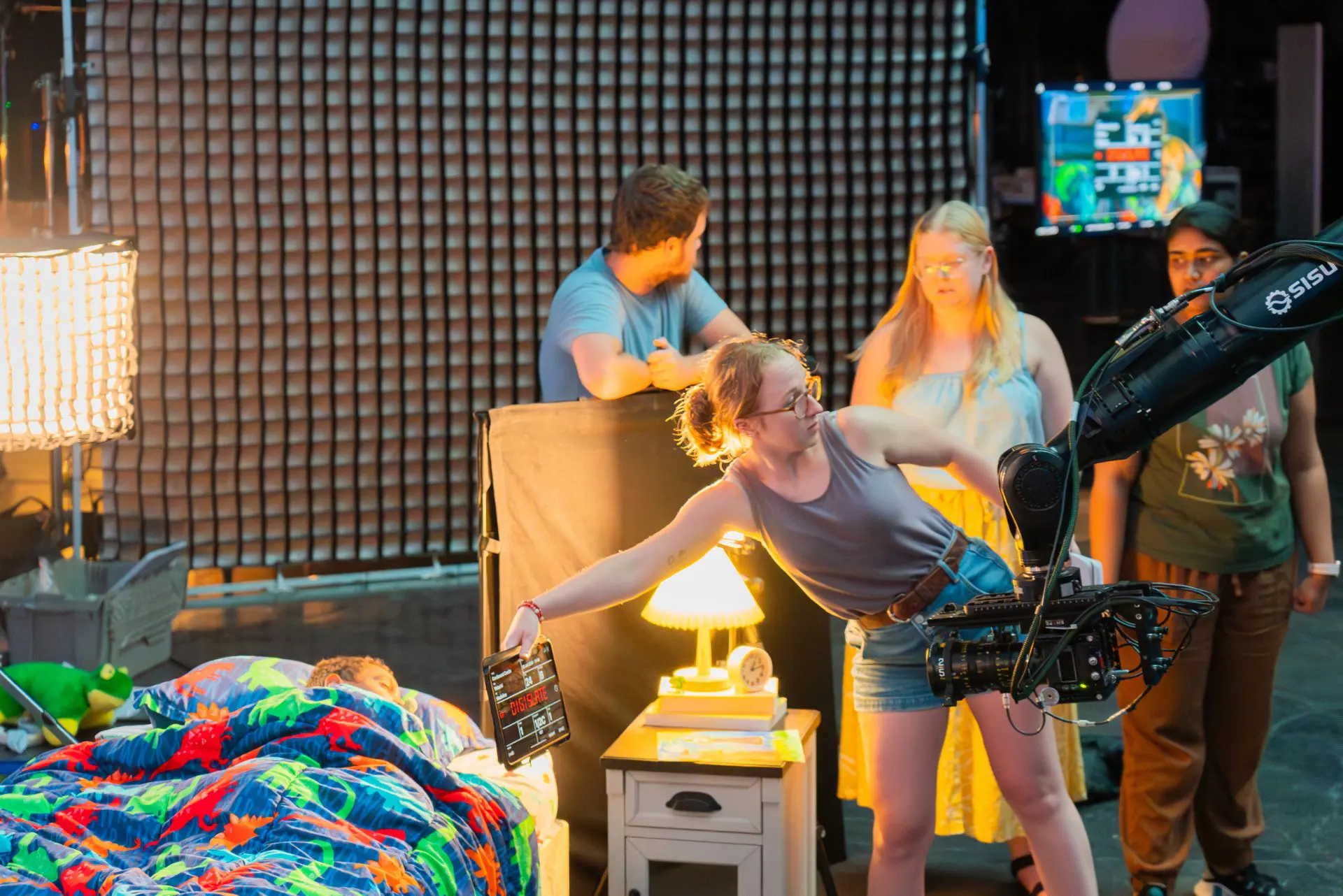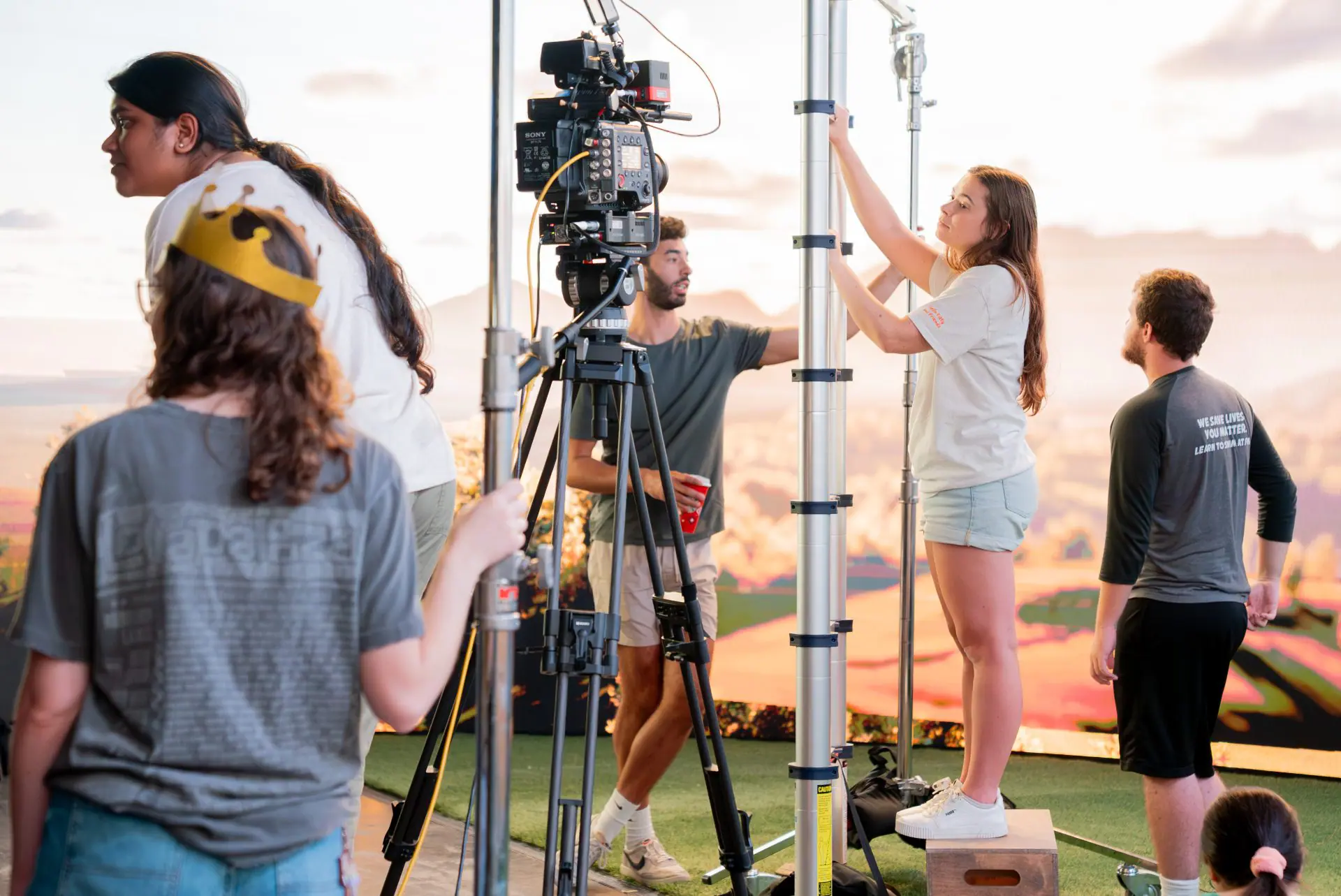 除了在这10周内教授导演课程之外,米勒还获得了索尼的专业支持——索尼提供了Venice 2摄影机和Burano摄影机以及全套的定焦镜头和G大师变焦镜头。Sisu Cinema Robotics也在影棚的使用时间内提供了一台长31英尺(约9.4米)的摄影机机械臂和他们的技术人员,作为学生项目的一部分。