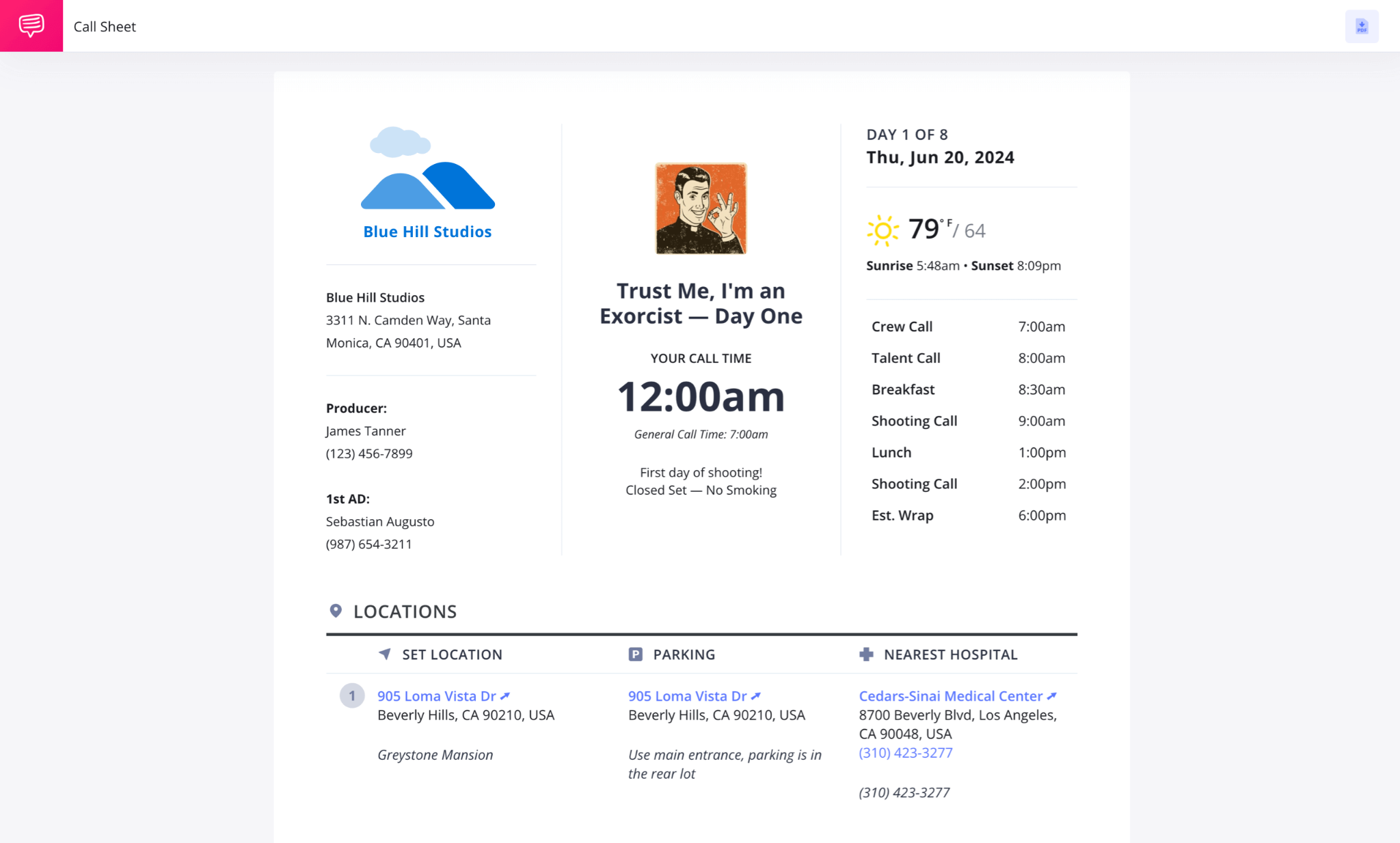 在制作通告单时,有很多信息需要记住,因此 Studiobinder 希望能帮你轻松搞定这件事。如果你忘记了要在通告单加上什么信息,也不用担心。所有需要的信息都在这准备好了。你只需要把具体信息填进去即可。