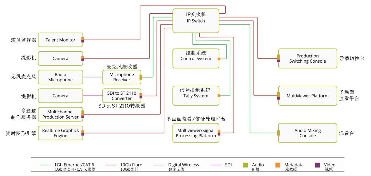 音频、视频、内部通信和控制数据都可以整合在一个标准化的网络上,调整适配任意体量的项目;需要多少控制室和演播室都可以安排路由。ST 2110尤其利于实况转播环境,它在其中取代了传统的 SDI 和 MADI 基础设施,同时提供了整体灵活性,可以让音频流和视频流在不同控制室进行处理,然后再结合到广播传输中。