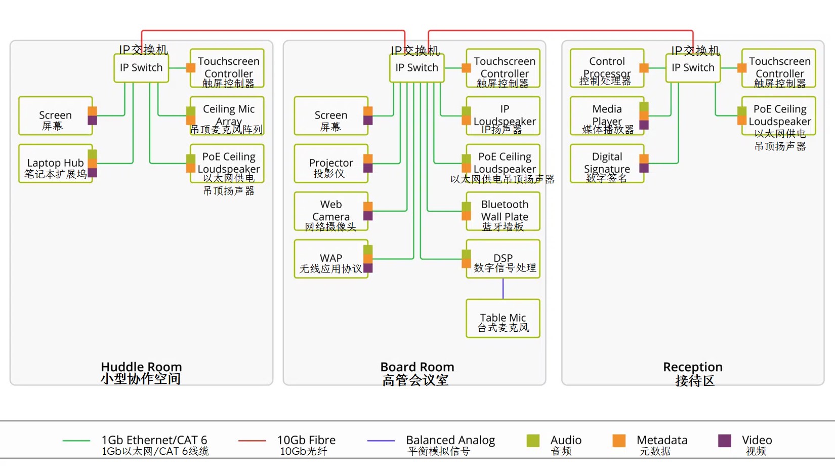 音频、视频、控制和内部通讯都可以整合到一个标准化的网络上,调整适配任何空间。当会议室或小型协作空间闲置时,可显示标识。