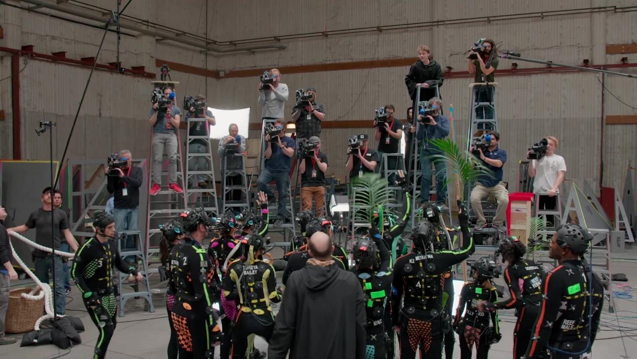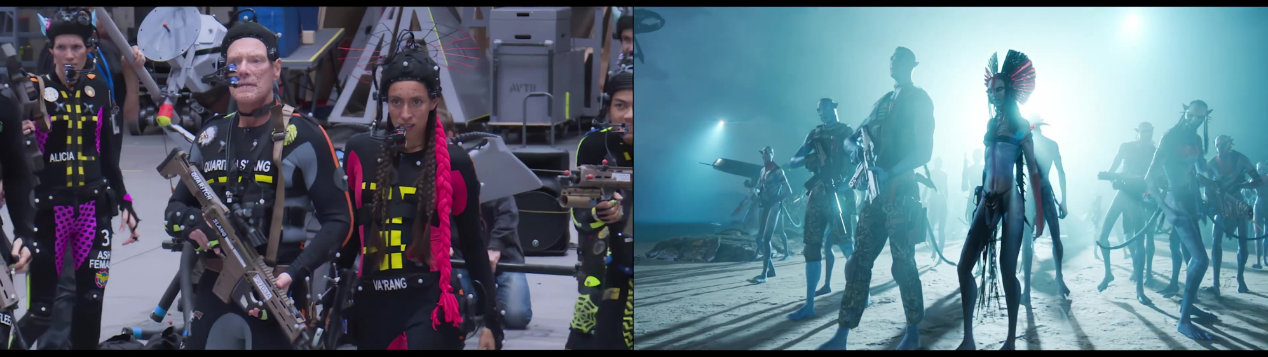 这些表演剪辑随后会在实验室里跟角色的 CG 建模组合起来,而实验室里的数字艺术家们会整合美术、环境、服装、生物和场景中所需的一切来创建可用于拍摄的文件,形成一个粗略的摄影机走位预览,由此制作团队就知道“该如何进行布光和拍摄,做好准备让阿詹可以进行最终的虚拟摄影机拍摄。就算演员不在场也可以按需在场景动捕舞台上无限次回放这些表演,并以此创建每个场景终剪所需的虚拟镜头覆盖。”