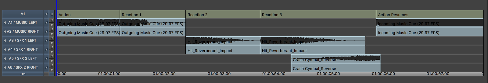 如果场景中有多个角色在场,并且你能找到他们合适的反应镜头,那也可以加上他们的镜头。如果你已经在之前的音乐提示中使用了强调音,可以尝试在每次切到新的反应镜头时添加单独的音效。然后,如果场景的下一拍会进一步推高冲突,你可以尝试在最后一个镜头下播放反转的镲片撞击声或渐强效果,在你切入动作持续的镜头时倒放至音量最强,并与下一个音乐提示的开端同步。