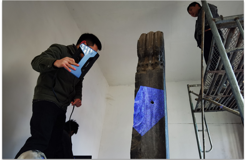 图6 一名技术人员正在使用 EinScan Pro 2X 2020 扫描仪来扫描一块西晋时期的碑。这款手持扫描仪可以在脆弱的文物表面进行高精度的数据捕捉。图源:EinScan