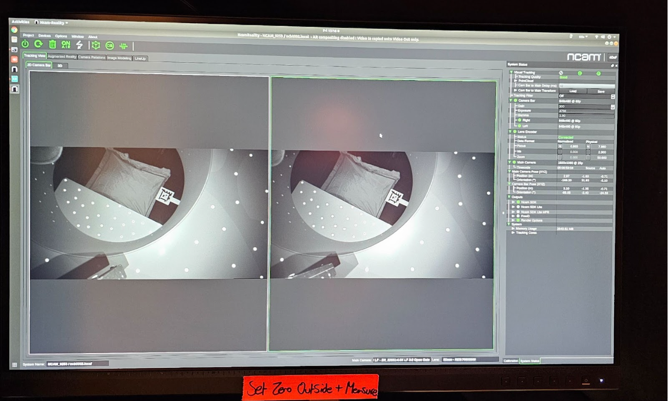 由于整个布景是一间完整搭建的屋子,有白色的天花板,因此摄影机跟踪是个巨大挑战。外向内跟踪系统不可用,因为无法在这个全覆盖的空间里安装外接摄影机。于是团队选择了内向外的跟踪方式,而它也有自己的复杂问题。团队使用 Ncam 系统(现为蔡司“追影”摄影机跟踪系统-ZEISS CinCraft Scenario)来解决覆盖限制。但是,白色屋顶搭配不断变化的布光为内向外的跟踪制造了一个很成问题的环境,需要依靠对比度高的环境特征来生成稳定的点云。