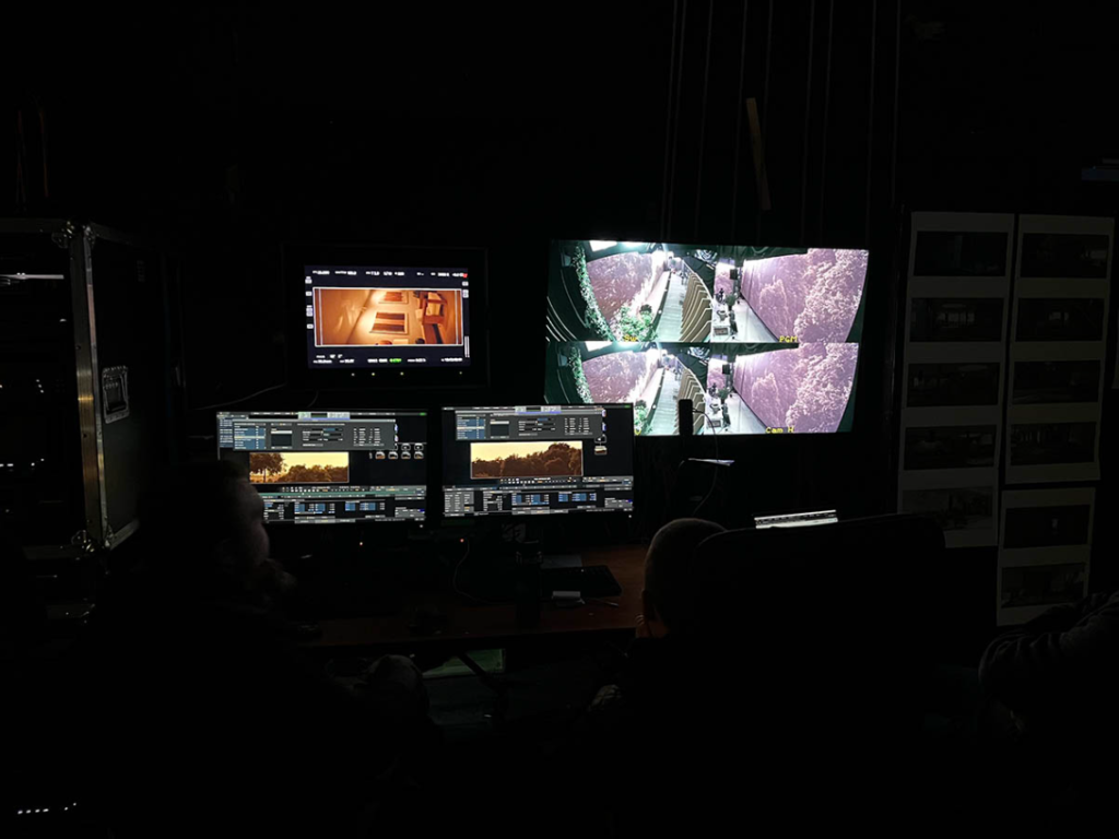 Copenhagen Visual 的团队利用大量实景参考素材(包括 LiDAR 扫描)为 LED 屏重建了真实的花园景观,以确保能进行准确的树木替换。这对于在虚拟制作场景与实景素材之间剪切时保持视觉连贯性十分重要。花园环境分成了远近不同的图层,以便随着摄影机在片场的运动创造出视差的移动。这样的图层排布还能发挥最佳系统性能,因为前景元素分辨率更高,背景元素分辨率更低。所有视频层都以 Notch LC 这个基于 GPU 的编解码器带 alpha 通道渲染出来,从而让 Live FX Studio 媒体服务器在 A6000 GPU 驱动的媒体服务器上流畅地同时运行8个视频层。