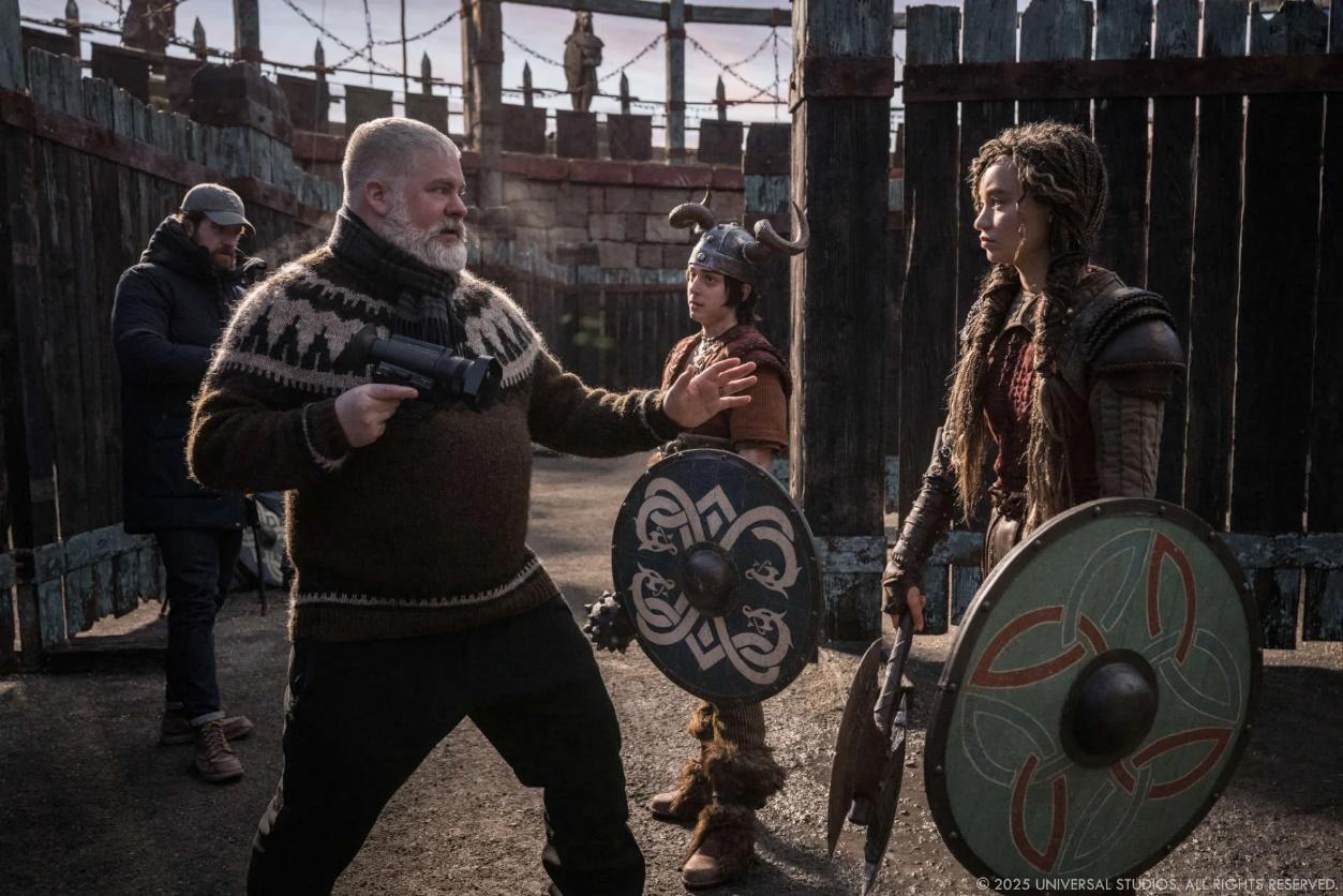 克里斯蒂安·曼茨:在前期制作初期,我们对苏格兰、法罗群岛和冰岛的拍摄地进行了勘景。那些直升机飞行体验让我们感受到了身临其境的刺激,而我们想在电影中重现这种感觉,比如让小嗝嗝骑着没牙仔在伯克岛海岸线上空翱翔。我们和迪恩以及(摄影指导)比尔·波普(Bill Pope)一起研究了这些真实的参考素材,从而确定要如何拍摄这些关键场景 —— 从摩托车追车戏和第一人称视角(FPV)无人机镜头,到高速滑翔伞和翼装飞行 GoPro 素材。像《壮志凌云2:独行侠》(Top Gun: Maverick)这样的电影给了我们灵感和启发,不仅因为这些电影人为了尽可能多的实拍而付出的努力,还因为其充满活力的摄影手法,让观众感觉仿佛真的置身于汤姆·克鲁斯(Tom Cruise)等人的驾驶舱之中。