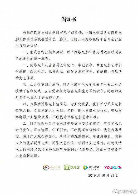 10月23日,腾讯、优酷和爱奇艺发布《关于推动网络电影在新时代承担新责任的联合倡议书》,呼吁全行业凝聚共识,尊重艺术创作规律,创作更多有筋骨、有道德、有温度的文艺作品;自觉承担责任培养电影生力军,加大扶持青年电影人才;呼吁更多人才关注、支持和加大行业投入,提升艺术水准;构建风清气正文艺环境和规范有序电影市场。