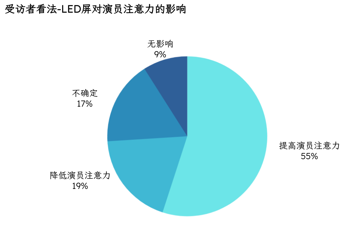 我们询问受访者,当演员背后是动态变化的 LED 屏而不是绿幕时,这是否会影响他们在表演中的注意力,得到的答案是肯定的。大多数受访者认为 LED 屏会提高演员的注意力(图2)。比如,在电影《奇幻森林》(The Jungle Book,2016)的拍摄过程中,剧组使用 LED 屏为饰演毛克利的小演员投射阴影,从而帮助他更好地融入角色,避免让表演缺乏实感(Baker,2016)。然而,LED 屏有时也会阻碍演员的表演,例如在《海盗旗升起》(Our Flag Means Death,2022)中,剧组使用 LED 屏充当背景里的一处水下场景,导致一些演员出现了晕船症状。(Schaefer,2022)。