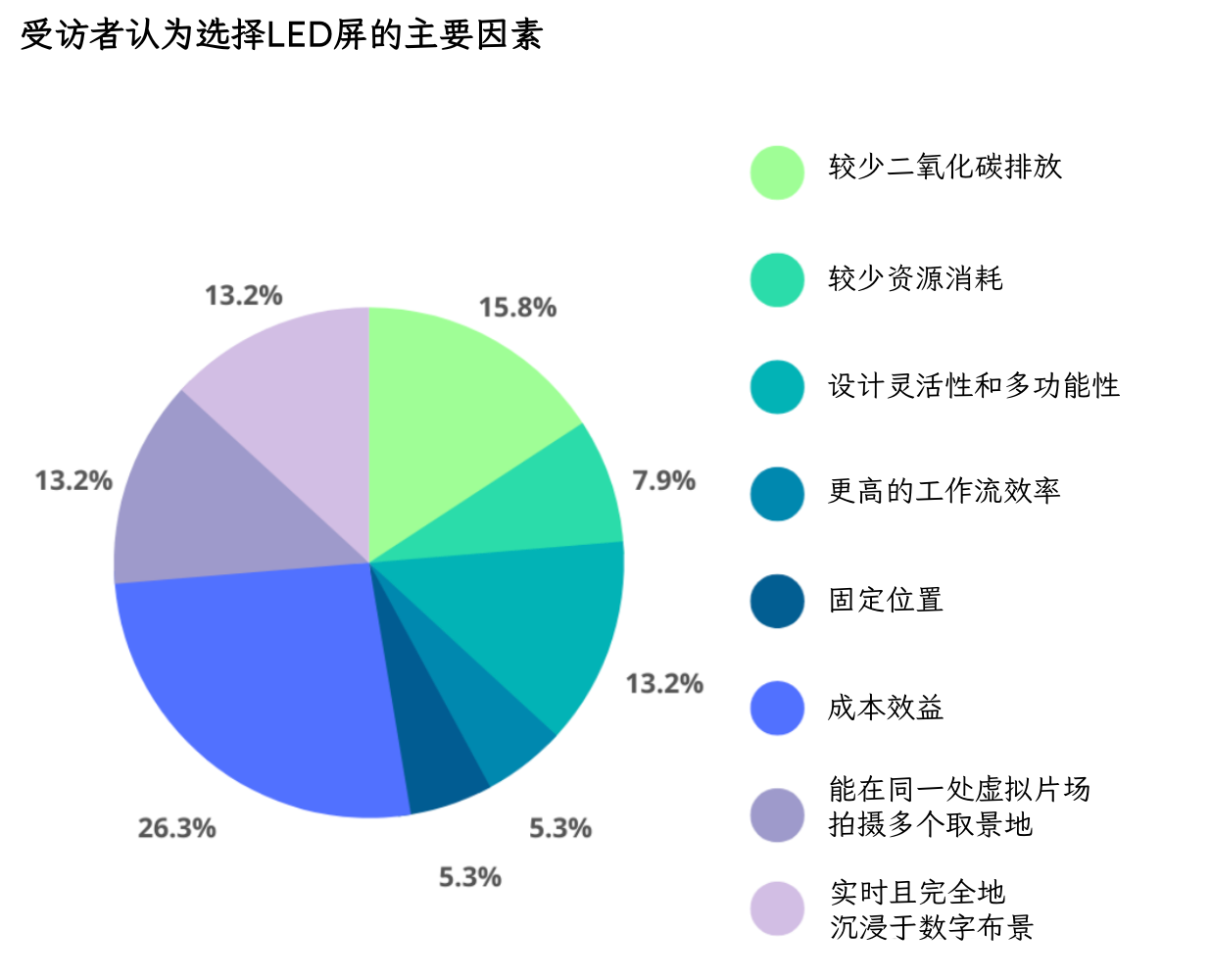 电影制作者必须要了解再决定是否使用 LED 屏时最重要的因素有哪些。在被问到哪些因素最重要时,受访者将成本效益放在首位,其次是较低的二氧化碳排放。