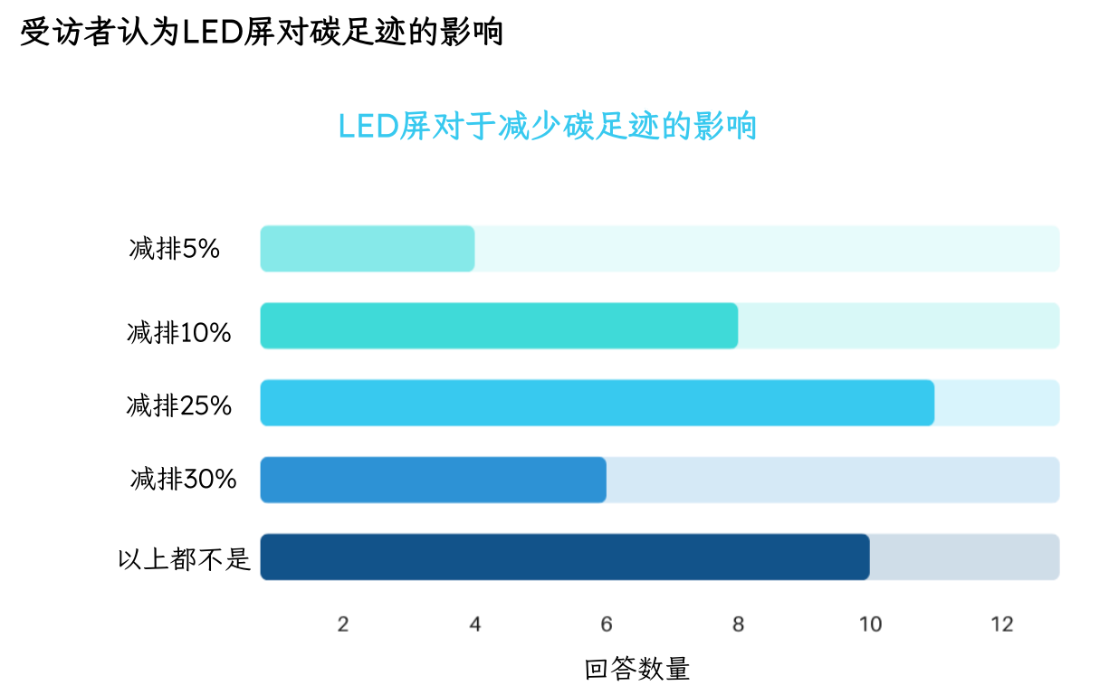 较低的二氧化碳排放是采用 LED 屏的主要因素之一。在被问到有多少受访者认为 LED 屏减少了碳足迹时,大多数都正确地回答出了25%,但也有许多受访者回答说答案不在5%-30%这一范围之内。