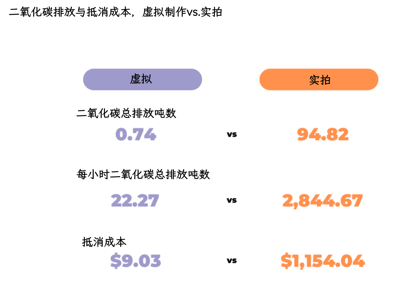 下图展示了虚拟制作与实拍在二氧化碳排放和抵消成本随时间推移所产生的巨大差异。(图6)