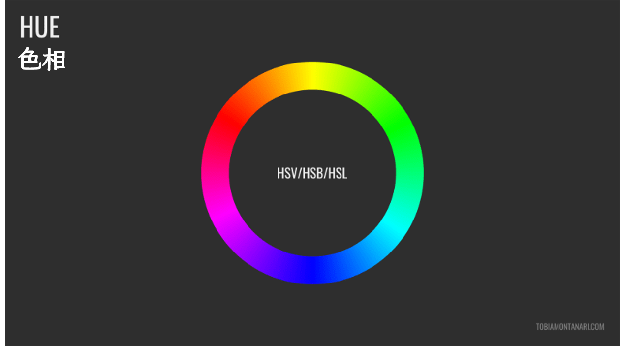 HSV/HSB 色彩模型 —— 即色相(Hue)、饱和度(Saturation)、明度(Value),或色相(Hue)、饱和度(Saturation)、亮度(Brightness)—— 以三个维度来表示色彩: