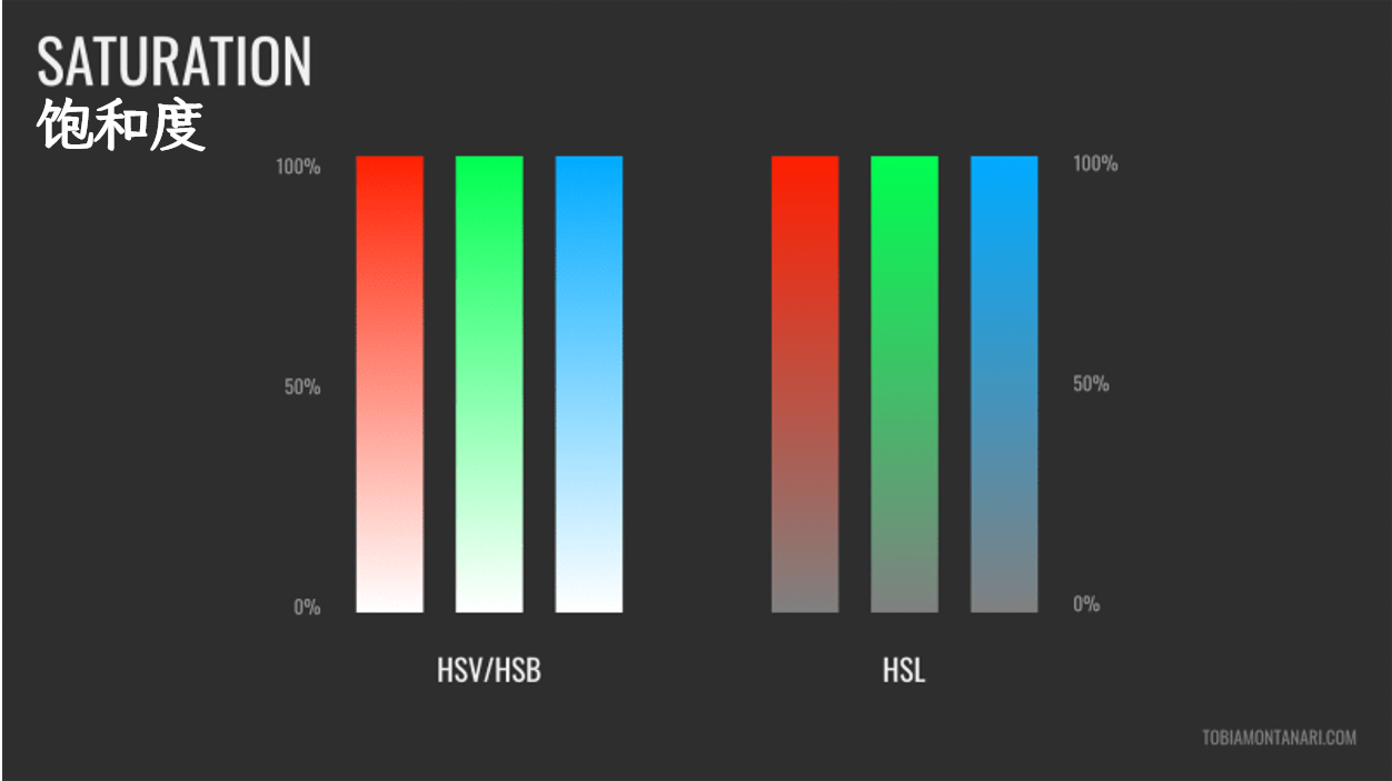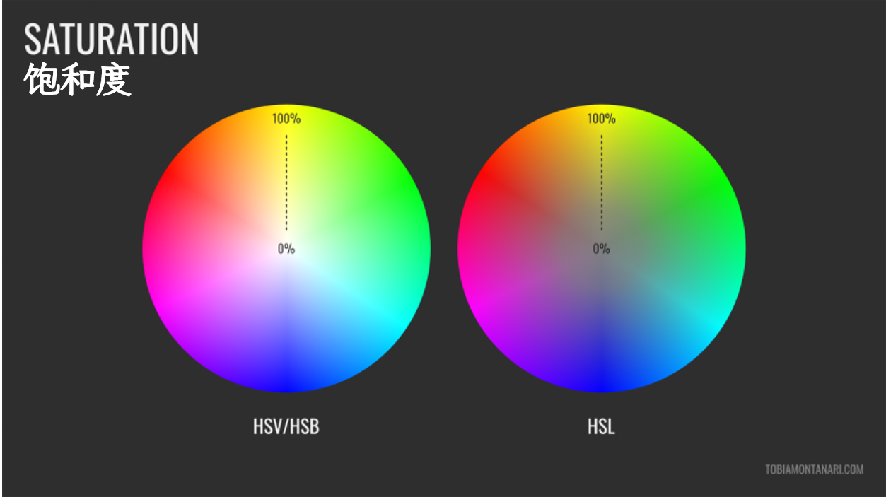 ●饱和度:饱和度代表色彩的纯度。饱和度越高,色彩就显得越纯。饱和度以0%-100%来表示。在 HSV/HSB 色彩模型中,0%饱和度以白色来表示。
