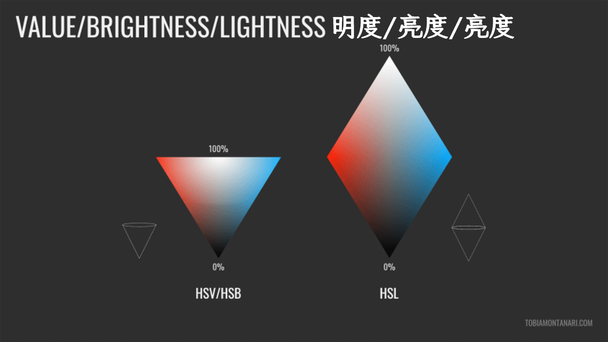 HSV/HSB 和 HSL 常常分别以锥体和双锥体来表示。