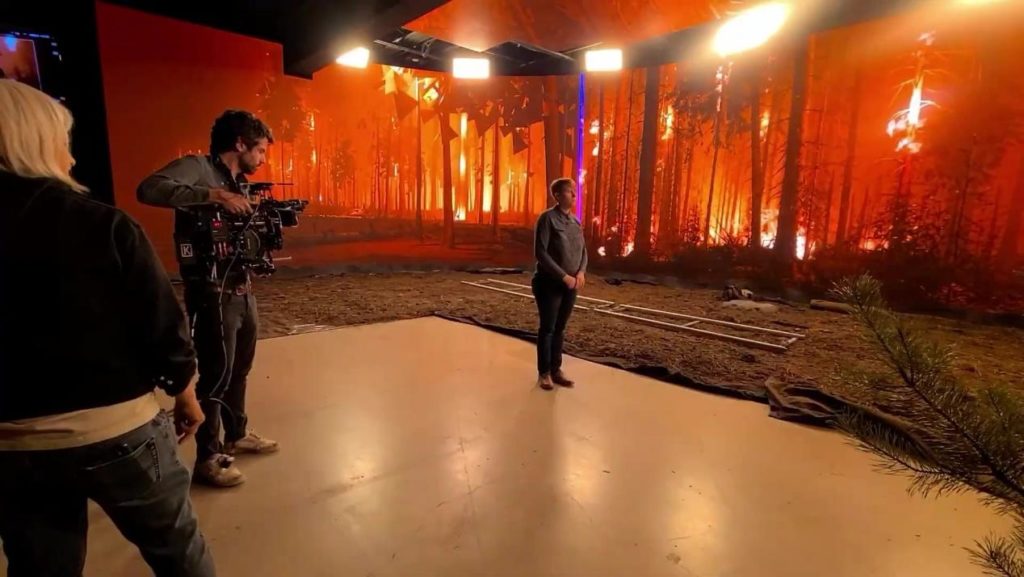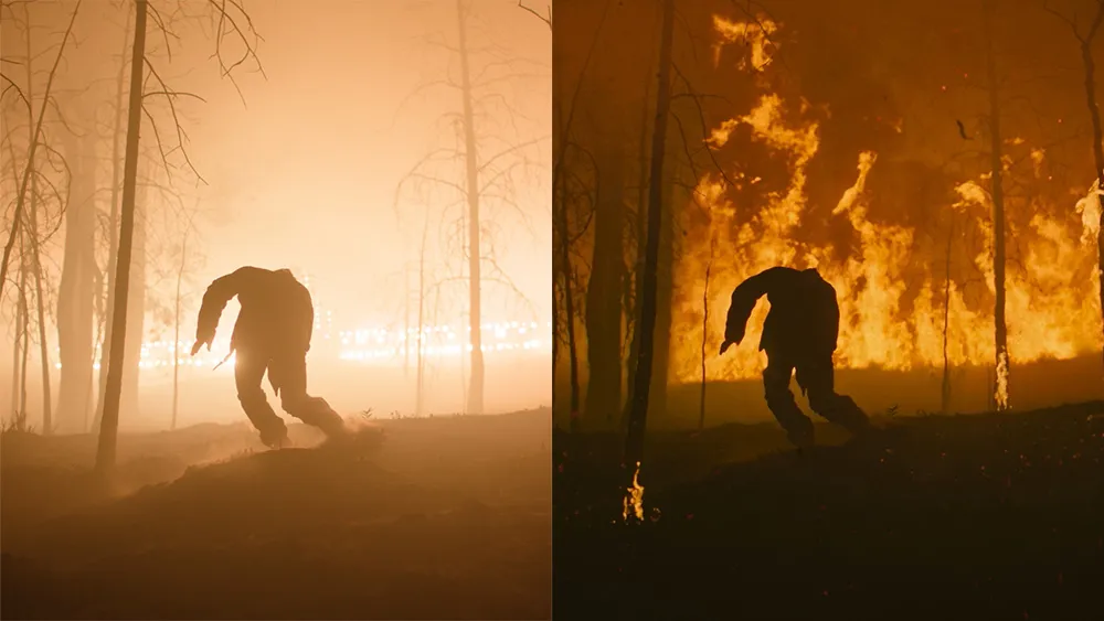 iDigital Creative Studio 团队为大火场景创建了完整的虚拟环境,并在 Vossler Studios 的虚拟影棚直接使用其渲染节点和媒体服务器完成了拍摄。摄影机内视效让艺术家和电影人得以实时打造所需的光线、规模和情绪。