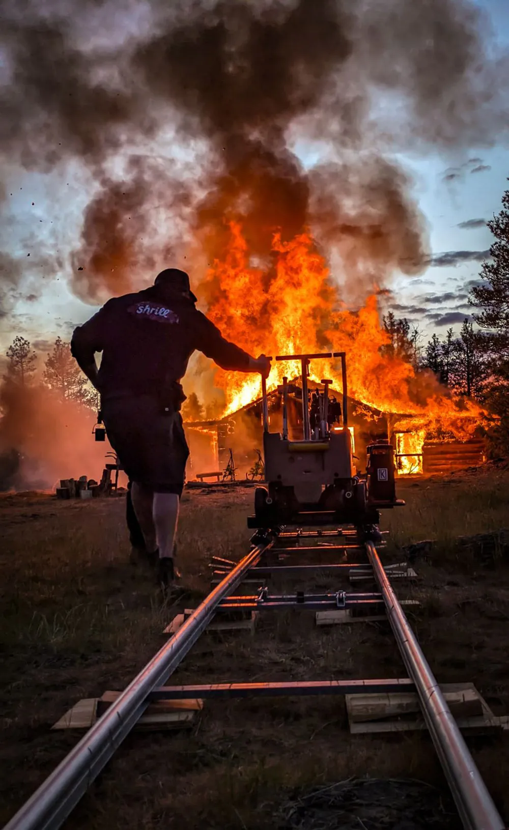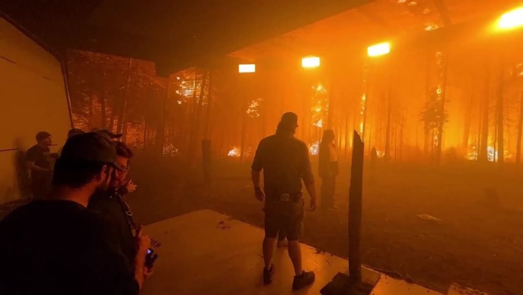 这场山火采用了实地取景加视效的制作方式。实景部分选在了一片此前已被真实发生过的山火摧毁的森林。“我初读剧本的时候,第一反应就是:好,我们必须要把效果做出来,”视效总监伊利亚·莫赫塔雷伊扎德(Ilia Mokhtareizadeh)在《好莱坞报道》的采访中说道:“这部影片并没有最……我不想说影片预算很有限,但我们确实要克服很多后勤挑战才能完成拍摄制作。我想确保我们拥有扎实的背景素材,便于我们以此为基础创建视效。