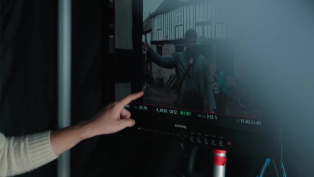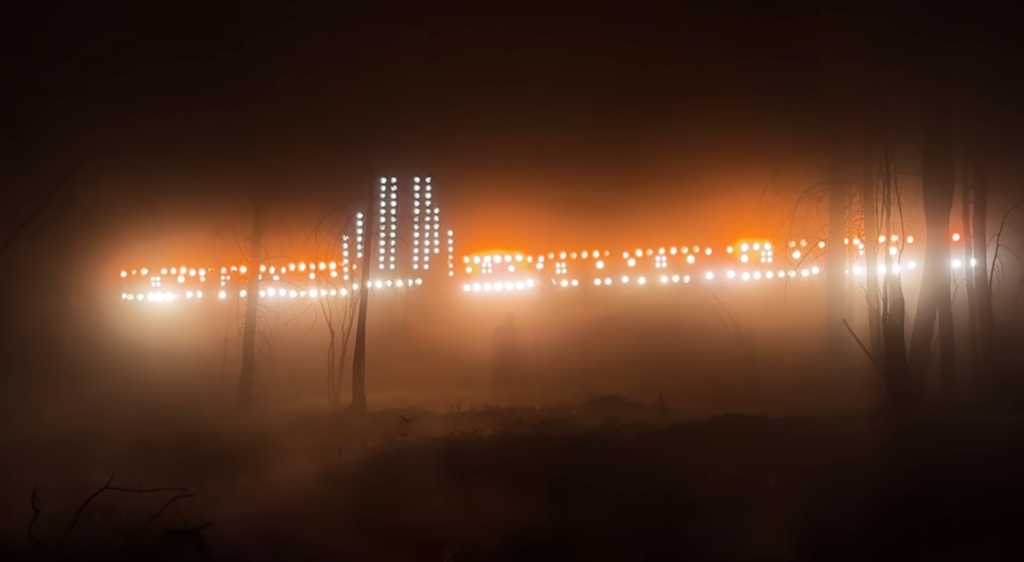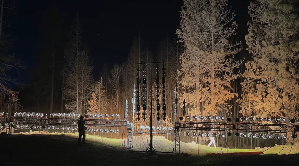 灯光师凯文·库克(Kevin Cook)找到了一个以 PAR 灯打造的、供演唱会使用的照明装置,我们把这个巨大的装置搭建在实拍的森林后方,以此提供所有橘色的背光,搭配上造烟机,在实地营造出大火所需的氛围。”这套布光装置也充当了埃哲顿表演在大火中寻找家人那个场景的视觉指引。