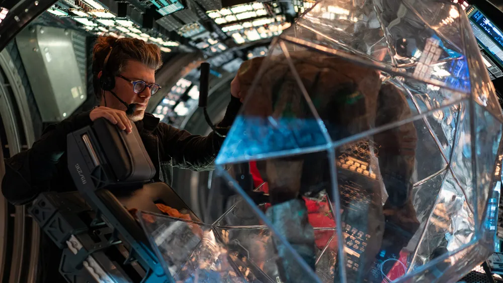 电影《挽救计划》(Project Hail Mary)片场,木偶师詹姆斯·奥尔蒂斯(James Ortiz)正在工作。图源:Jonathan Olley/Amazon Content Services
