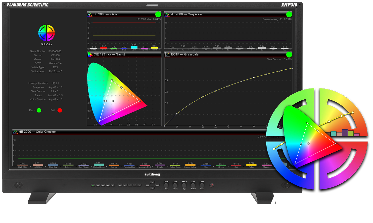 连接至兼容探头后,启动 GaiaColor Analyzer 对监视器进行测量,短短60秒即可直接在屏幕上呈现一份完整的质控报告。这项工具会根据监视器当前配置自动检查校正,意味着它能准确适配尊正XMP和XMP C系列监视器上支持的数千种可选配置组合,且完全不需任何额外操作或设置。