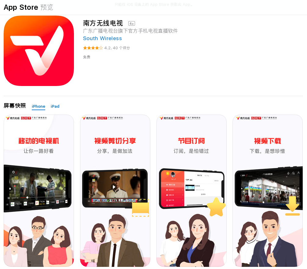 “南方无线电视”是广东广播电视台去年初上架的官方手机电视直播视频软件。电视频道涵盖:热门央视、火爆卫视和广东本地电视。具体功能有:7X24小时电视节目回看、预约、下载、收藏等;还可以任意截取3分钟节目片段,发布到微信朋友圈。声称可以提供无卡顿、无延时、高清、高品质的视频体验,让用户享受到免费的VIP服务。