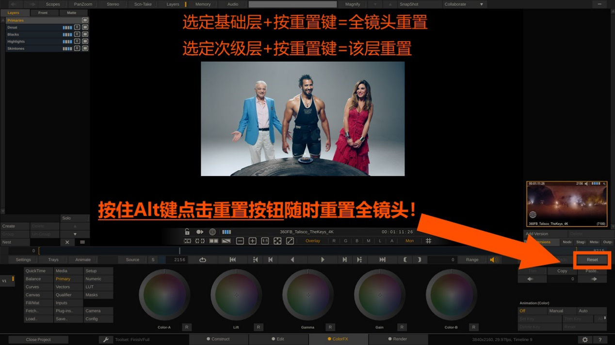 在SCRATCH调色特效页面点击重置键,即刻重置层堆栈中的当前选定层。当在层堆栈中选定基础层进行重置时,全镜头重置。这相当于快捷键Alt+点击重置键的作用:此时无论在层堆栈中选定哪一层,都会对全镜头进行重置,删除所有层!(T)