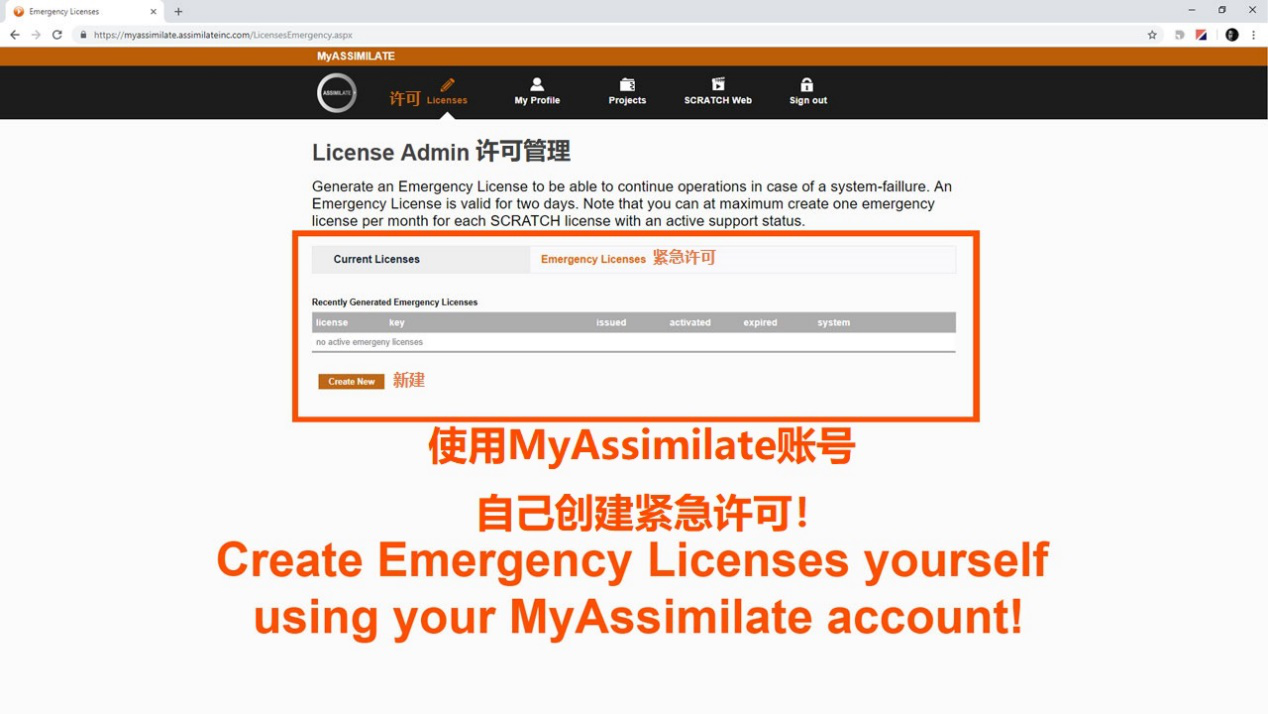 这种情况下,只需登陆自己的MyAssimilate账号,点击新建即可创建自己的紧急许可密匙,SCRATCH继续工作不是问题!(T)