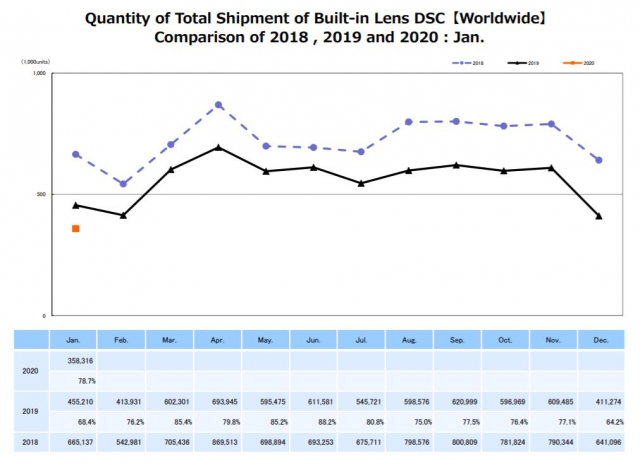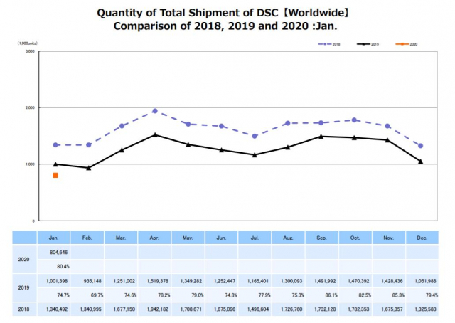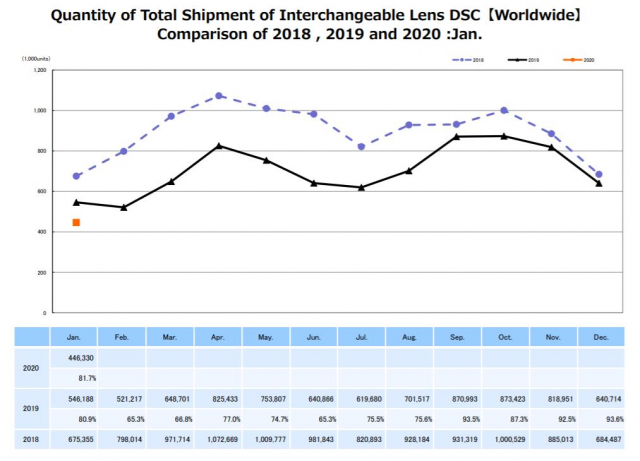 CIPA公布了2020年1月全球相机出货量数据,1月份的数据再创历史新低!从来没有哪家公司在1月里卖出这么少的相机(从2012年的峰值以来),无反相机的销售量下降了11%(按照数量算)和19%(按照价格算)。