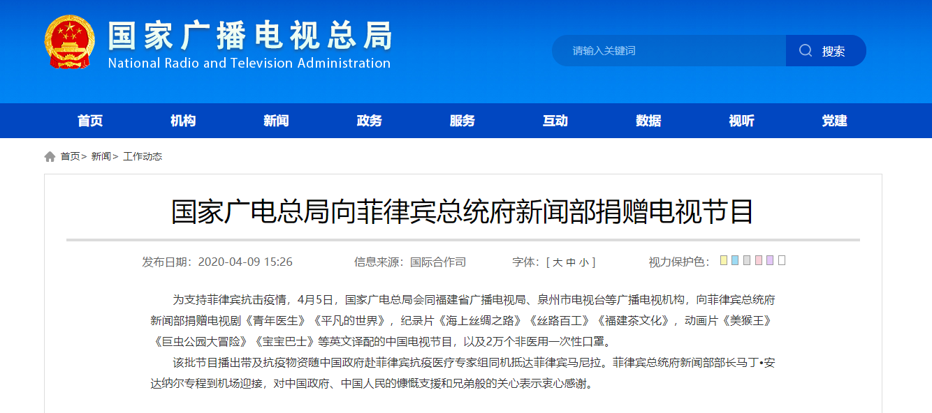 国家广电总局会同福建省广播电视局、泉州市电视台等广播电视机构,向菲律宾总统府新闻部捐赠多部电视剧以及2万个非医用一次性口罩支持菲律宾抗击疫情。