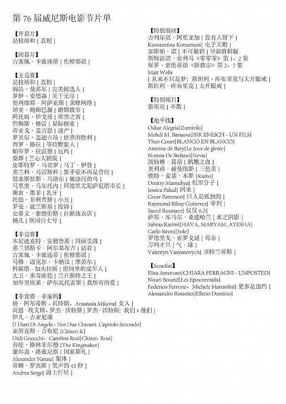 作为世界上历史最悠久的电影节,威尼斯电影节周四在罗马正式公布其第76届阵容。评审团主席卢奎西亚·马特尔将带领由国际知名影人组成的评审团颁发最高奖项:最佳影片金狮奖、评审团特别大奖、最佳导演银狮奖等等。