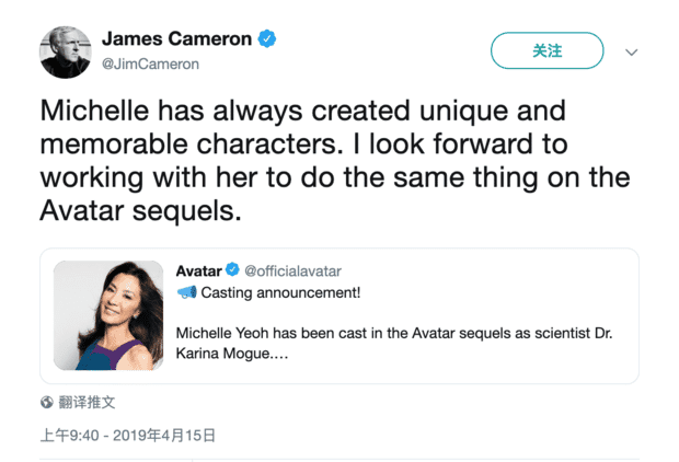 导演詹姆斯·卡梅隆发布消息称,杨紫琼加盟《阿凡达》续集饰演科学家卡丽娜·莫格博士。新加盟的还有凯特·温斯莱特等,另有萨姆·沃辛顿、佐伊·索尔达娜、西格妮·韦弗等回归。